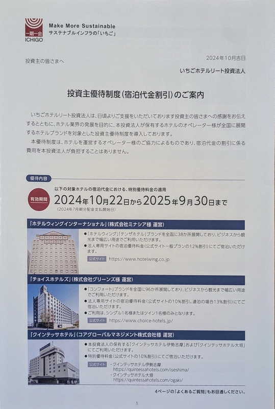 投資主優待制度として宿泊代金割引の案内が届きました。