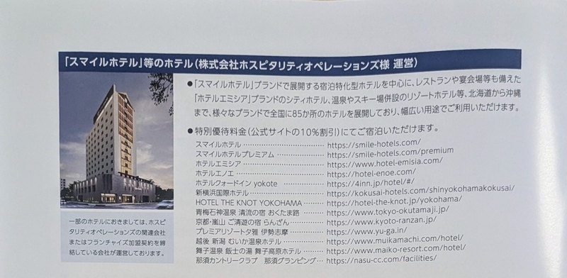 ホテルも値上がりしている中なので、全国のビジネスホテルが安くなるというのはありがたい優待です。